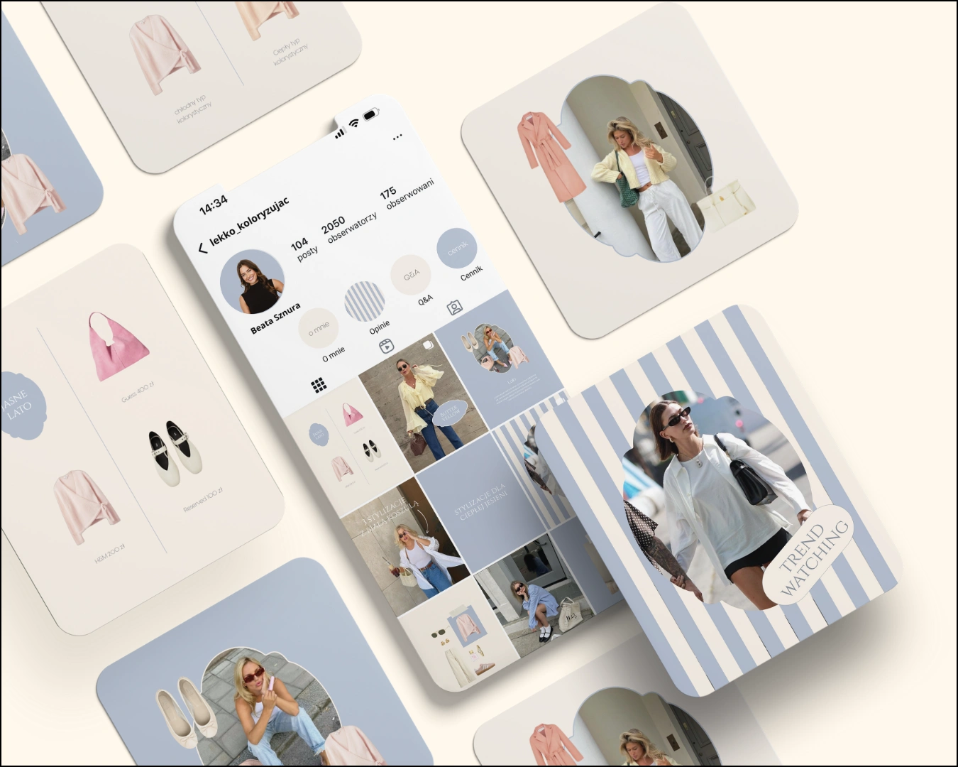Projekt marki tworzę jako prosty system, który uporządkuje Twój wizerunek i ułatwi codzienną pracę przy social mediach.